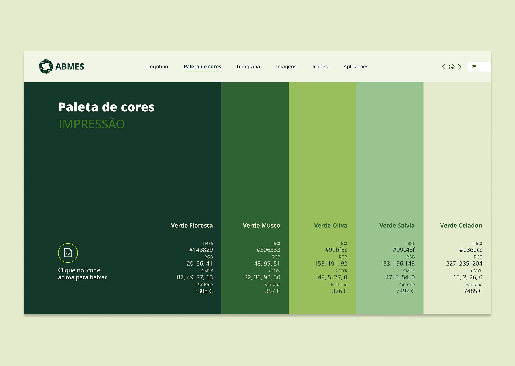 Paleta cromática: predominância de tons verdes que variam do Verde Floresta ao Celadon para impressão, e do Verde Petróleo ao Verde Pálido para aplicações digitais