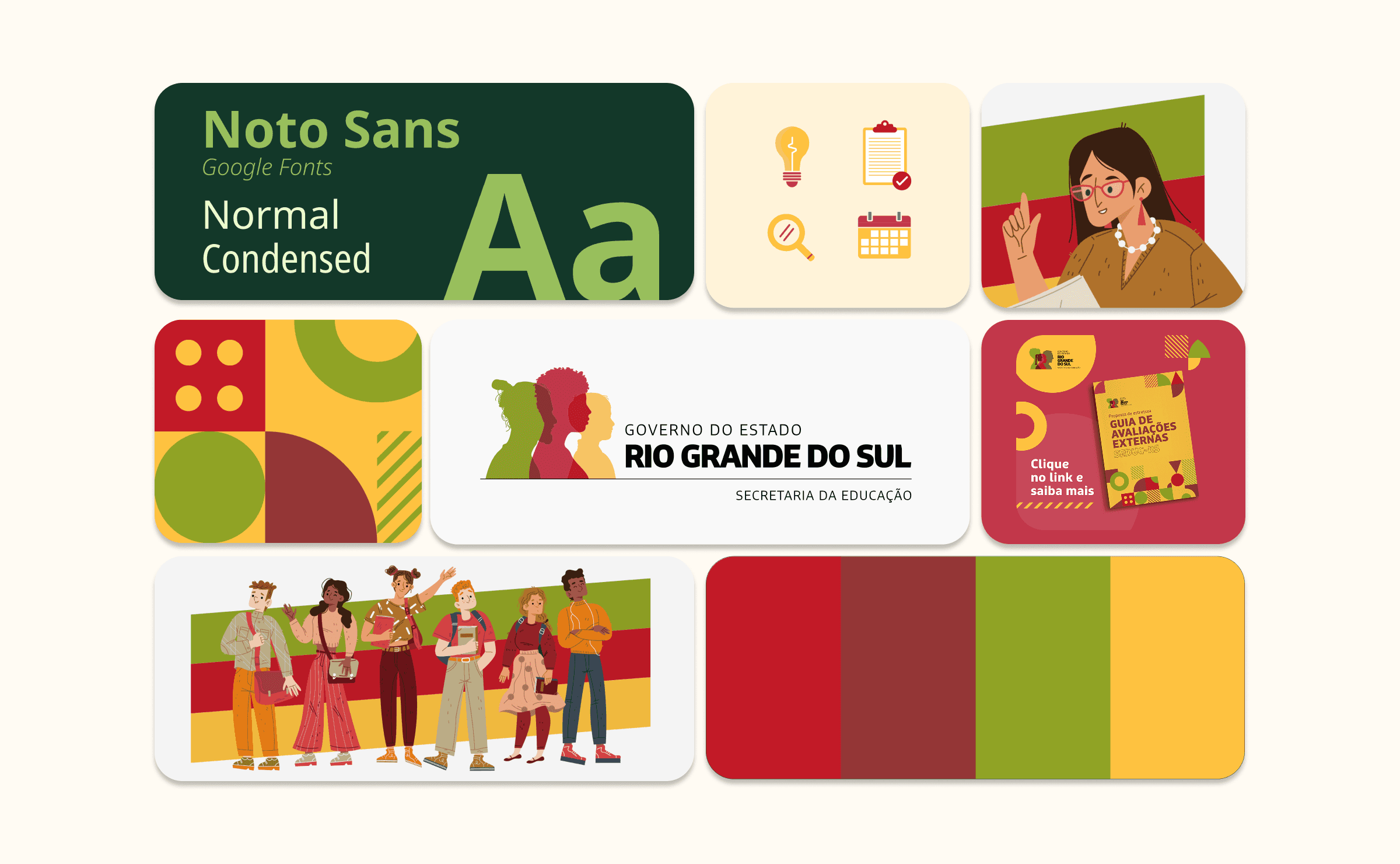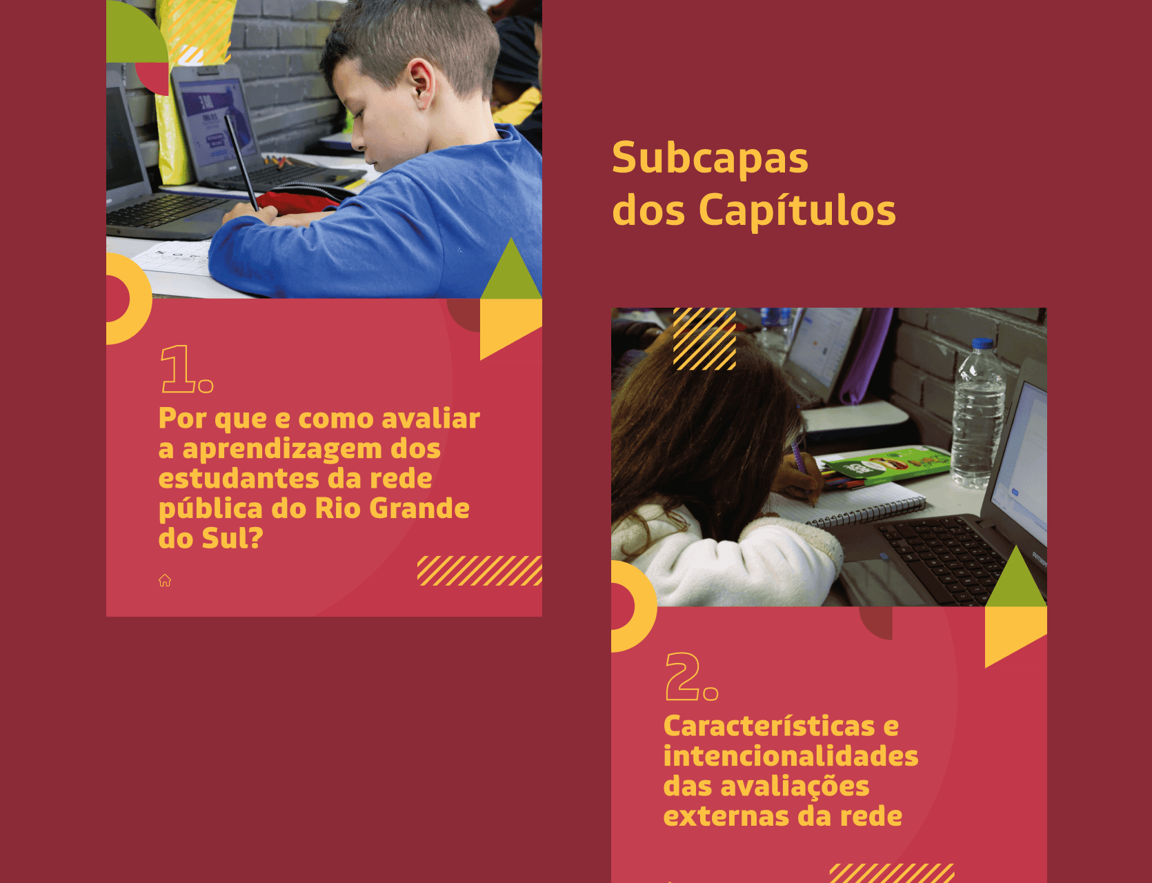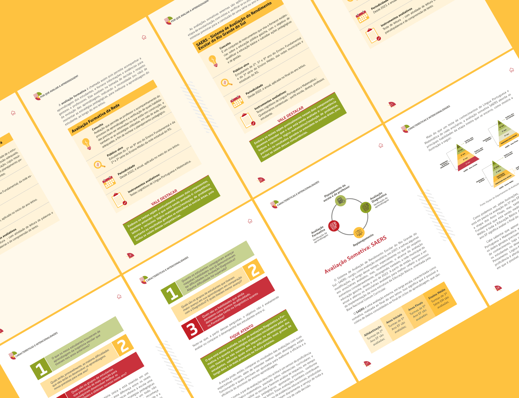 A Arandu desenvolveu um design moderno e atrativo que utiliza a paleta de cores da própria identidade visual da Secretaria de Educação do Rio Grande do Sul, composta por amarelo, vermelho, verde e laranja. O projeto combina elementos gráficos geométricos, ilustrações de estudantes e professores, infográficos explicativos e tipografia amigável, resultando em uma linguagem visual profissional e acessível.