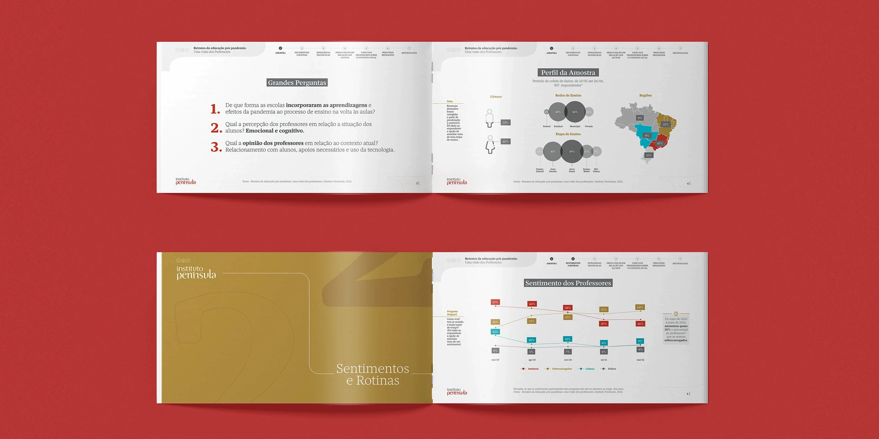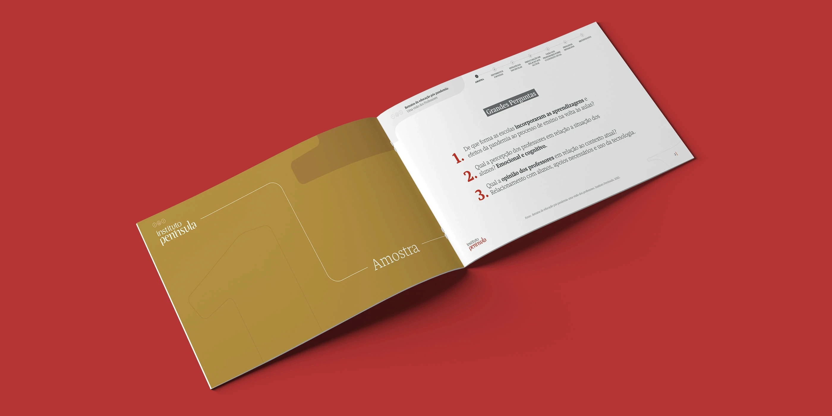 O Instituto Península apresentou o documento "Retrato da Educação no pós-pandemia", uma publicação que sintetiza pesquisas sobre os desafios e transformações enfrentados pelo sistema educacional brasileiro. A Arandu foi responsável pela diagramação completa deste material estratégico, desenvolvendo uma linguagem visual que facilita a compreensão de dados estatísticos complexos. O documento foi concebido como ferramenta de comunicação institucional destinada a educadores, gestores públicos e formadores de políticas educacionais, oferecendo uma visão panorâmica baseada em evidências sobre o estado da educação no período pós-pandemia.